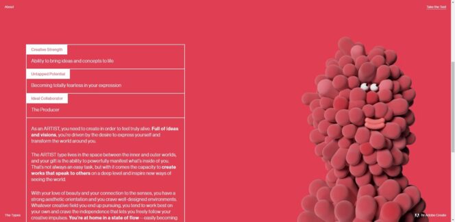 Pour chaque type de créatif, les forces et les potentiels inexploités sont détaillés. Vous pouvez ensuite partager votre résultat sur les réseaux sociaux ou télécharger les jolis éléments graphiques conçus pour l’occasion (images, GIF animé, vidéo etc.). Pour créer ce test de personnalité et ces contenus créatifs, Adobe s’est basé sur le travail de plusieurs artistes de renom : Daniel Powell, Brendan Baker, Daniel Evans, Anton Hjertstedt, Isabel + Helen, Carolyn Gregoire et l’agence Anyways Creative.