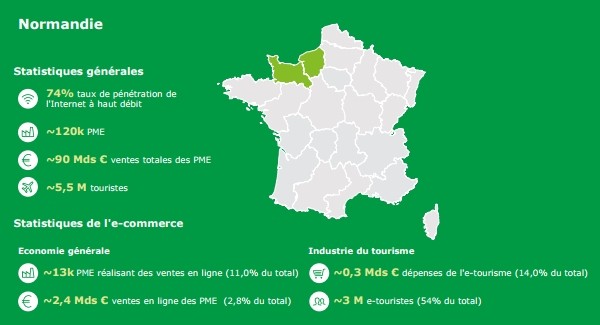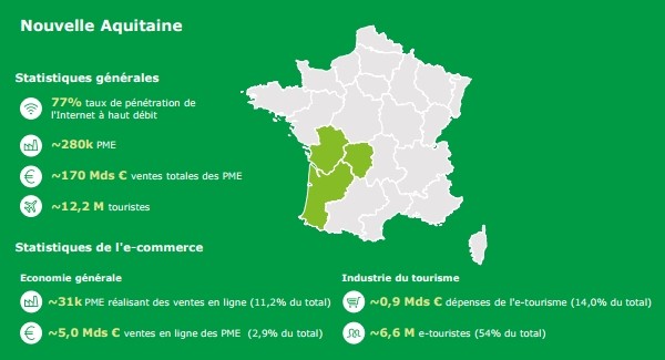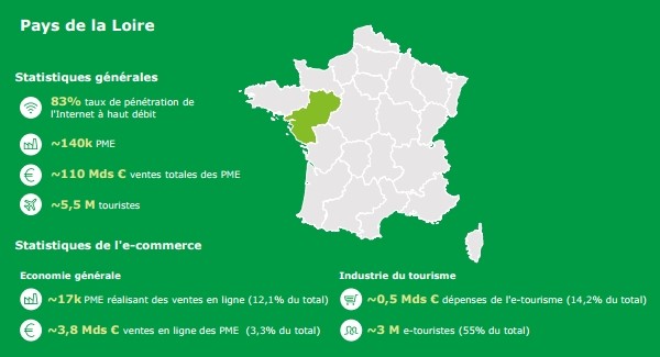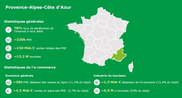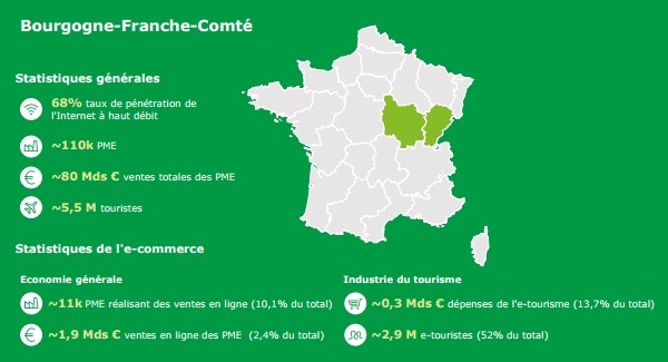 Ci-dessous, vous retrouvez les chiffres clés de chaque région française : taux de pénétration d’Internet à haut débit, nombre de PME, chiffre d’affaires, nombre de touristes, nombre de PME réalisant des ventes en ligne, chiffre d’affaires réalisé sur Internet et les dépenses dans l’e-tourisme.