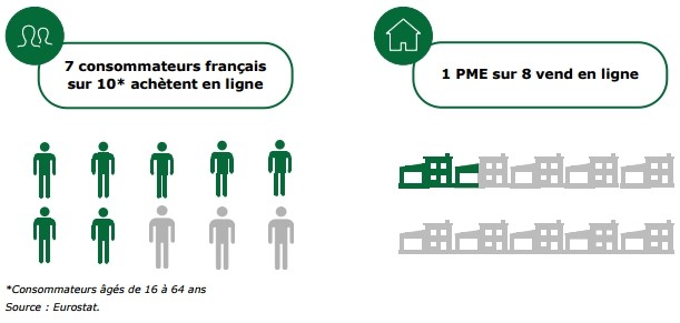 Deloitte remarque également un écart important entre l’usage du digital par les entreprises françaises et celui de leurs clients. En France, 7 consommateurs sur 10 achètent des produits sur Internet et paient directement en ligne. Dans le même temps, seule une grande entreprise sur 2 et une PME sur 8 dispose d’une solution e-commerce. Du coup, les consommateurs français se tournent vers les entreprises étrangères. Les Français sont six fois plus susceptibles que les Allemands d’avoir recours à l’importation de produits étrangers lors de leurs achats sur Internet.