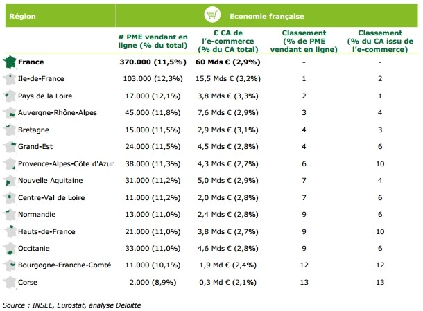 En France, nous remarquons une digitalisation relativement homogène entre les différentes régions. Ce tableau représente la part du e-commerce pour les PME de chaque région française. L’Île-de-France, les Pays de la Loire, la région Auvergne-Rhône-Alpes et la Bretagne s’en sortent un peu mieux que les autres.