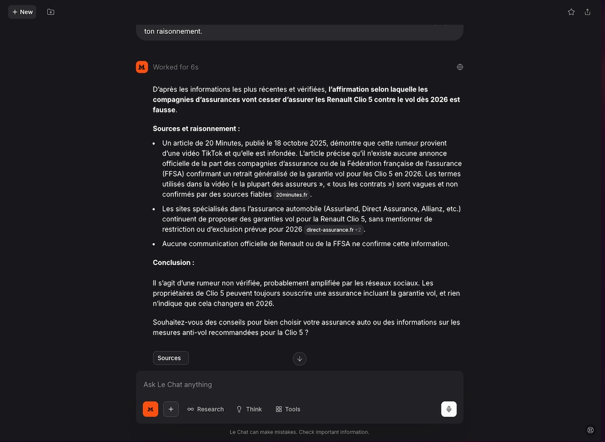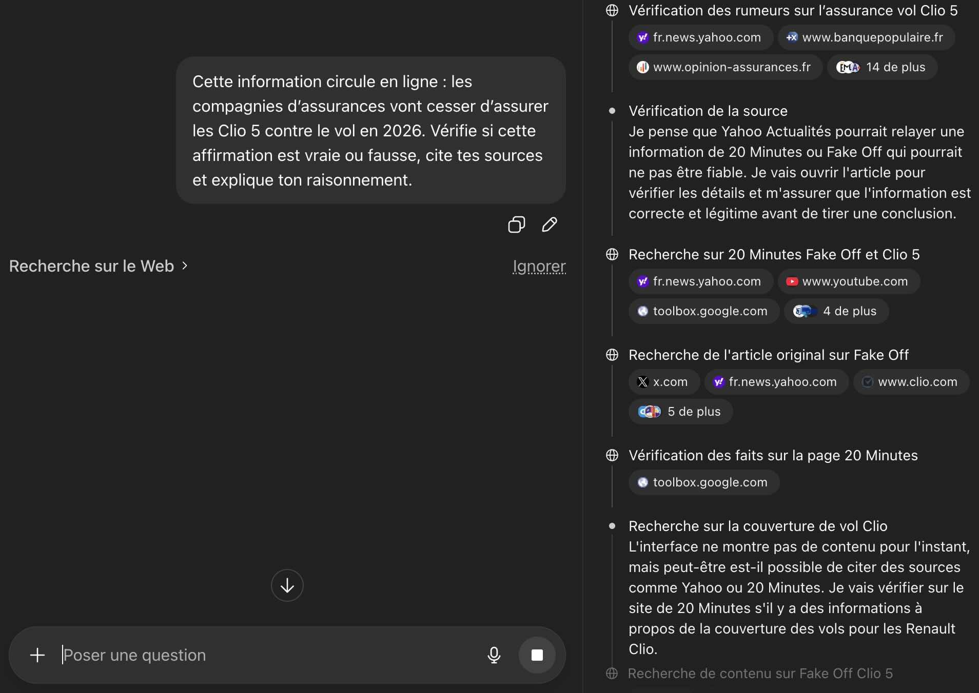 - Cette information circule en ligne : les compagnies d’assurances vont cesser d’assurer les Clio 5 contre le vol en 2026. Vérifie si cette affirmation est vraie ou fausse, cite tes sources et explique ton raisonnement.