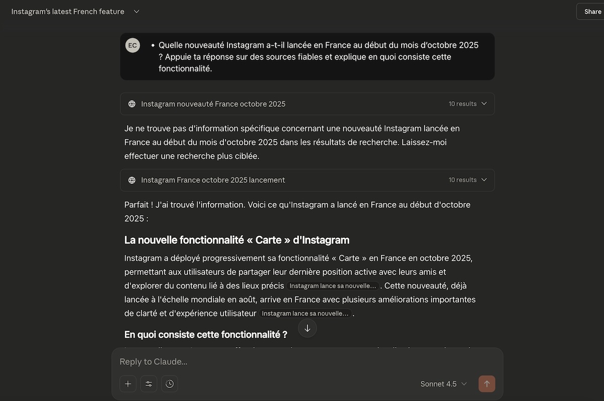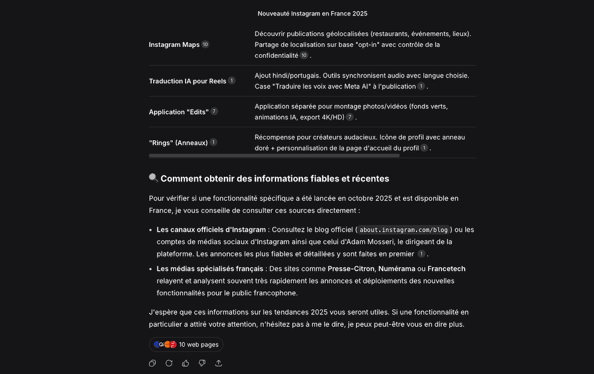 Déployée progressivement à partir d’octobre 2024, la fonctionnalité Recherche sur le Web affiche, il faut le dire, un réel potentiel. Bien aidé par la précision de la date – un repère probablement indispensable, tant Instagram multiplie les tests et les mises à jour – et après un léger temps de réflexion, ChatGPT a facilement identifié la Carte Instagram. Pour en décrire le principe, il s’est appuyé sur des sources officielles (newsrooms de Meta et d’Instagram), mais aussi sur des articles provenant de médias spécialisés (BDM) et grand public (RTL, TF1).