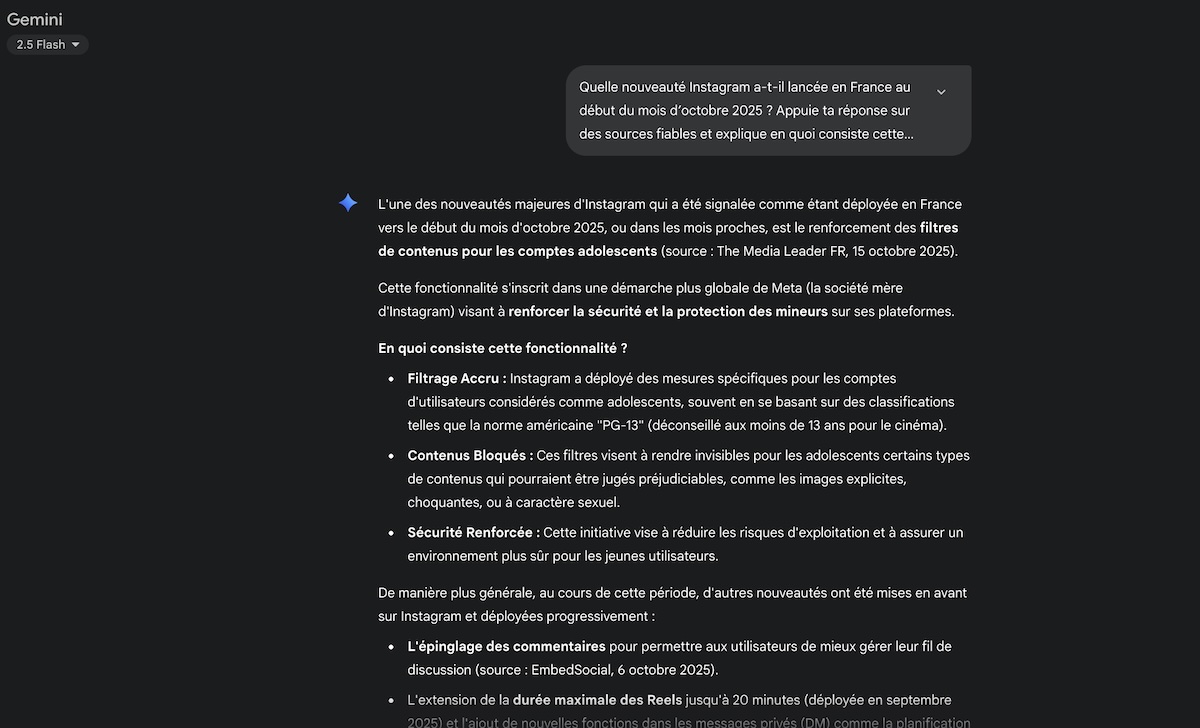 Le test se révèle moins concluant avec Gemini. Bien qu’il dispose historiquement d’un accès en temps réel au moteur de recherche de Google, l’agent conversationnel n’a pas su, par exemple, faire le tri dans les annonces récentes du réseau social de Meta pour identifier la Carte Instagram. Même si, dans le doute, il a bien précisé qu’elle faisait partie des fonctionnalités récemment déployées en France.