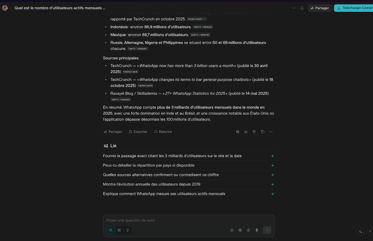 La principale force de Perplexity, du moins dans sa version gratuite tant l’outil est complet dans sa version payante, se situe ailleurs. Elle réside dans sa capacité à prolonger la discussion en suggérant des questions de suivi. Sur la requête liée à WhatsApp, par exemple, l’outil propose : « Explique comment WhatsApp mesure ses utilisateurs actifs mensuels » ou « fournis le passage citant les 3 milliards d’utilisateurs sur le site ou la date ». Des relances qui permettent de vérifier ou d’ajuster ses réponses en déclenchant une nouvelle recherche.