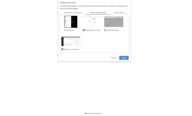 - Cliquez sur Partager. L’outil vous redirige directement vers la fenêtre concernée et vous pouvez dès lors faire les manipulations que vous souhaitez. Une icône « Rec » située sur l’onglet de la page RecordScreen vous indique que le service est bien en cours d’enregistrement.