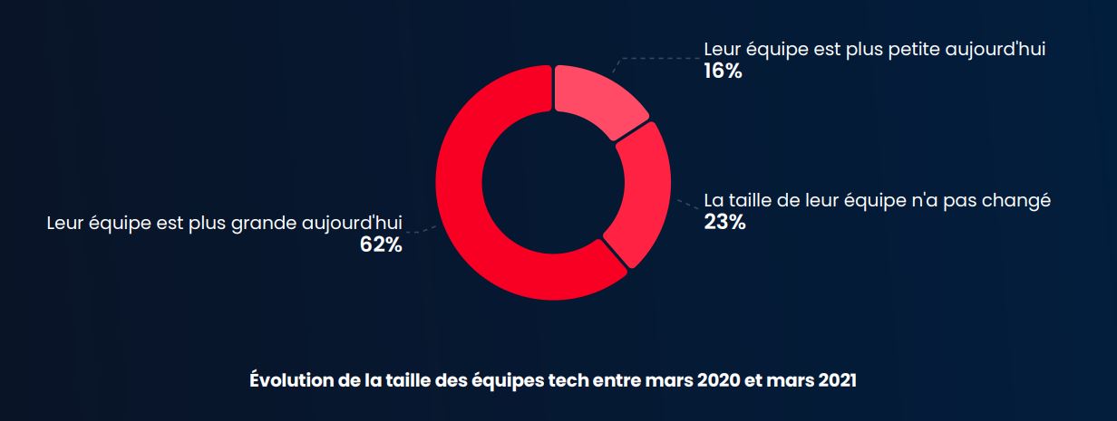 À contrario, seulement 16 % des personnes interrogées ont déclaré avoir désormais une équipe plus petite aujourd’hui. Des chiffres qui peuvent s’expliquer par le virage à 360° qu’ont dû prendre certaines entreprises pour accélérer leur transformation digitale.