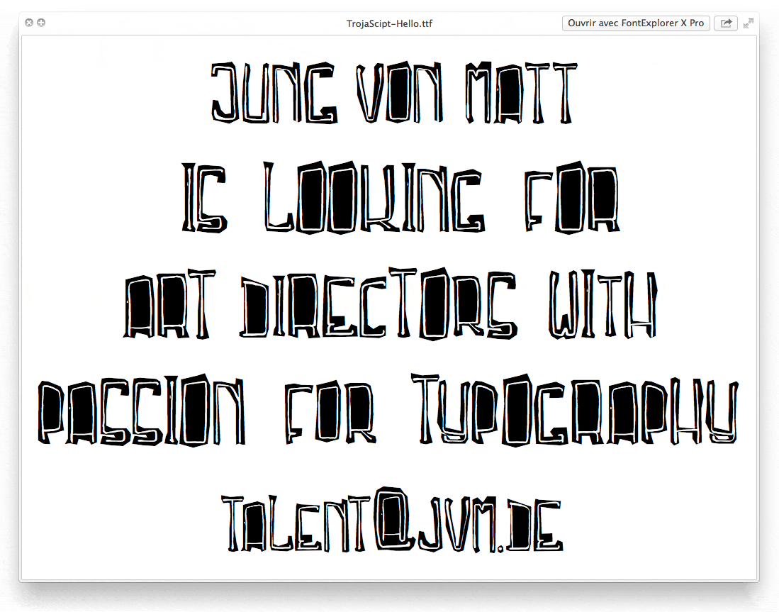 L’agence allemande Jung von Matt vient de recruter par le biais d’une opération très originale. Elle a mis en ligne une typographie « Trojan Script » sur les sites spécialisés dans le domaine. La typo a été téléchargée plus de 14 000 fois sur des sites références comme dafont.com. Sauf que l’ordre des lettres de l’aperçu de la typo, qui suit normalement l’ordre des lettres d’un clavier, a été modifie dans « Trojan Script » pour laisser apparaître une offre d’emploi : « Jung von Matt est à la recherche d’un DA passionné par la typographie ». L’offre a intrigué 23 candidats potentiels qui ont postulé, et l’agence en a retenu un : Paul.