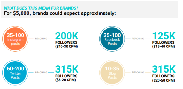 L’une des principales préoccupations des responsables marketing c’est le coût de ce genre de partenariat. Selon le rapport Bloglovin, les influenceurs sont tous relativement clairs sur leurs honoraires : 84 % d’entre eux demandent moins de 250 $ par post Instagram, 87% moins de 500 $ pour un billet sur leur blog. Pour un post Facebook, 90% facturent moins de 250 $ et la majorité des interrogés demandent environ 150 $ par tweet. Pour se donner une idée, si une marque se donne un budget de 5000 $ pour sa stratégie social media, elle pourrait toucher 200K followers avec une 35 à 100 posts Instagram ou encore 315K avec 10 billets sur les bons blogs.