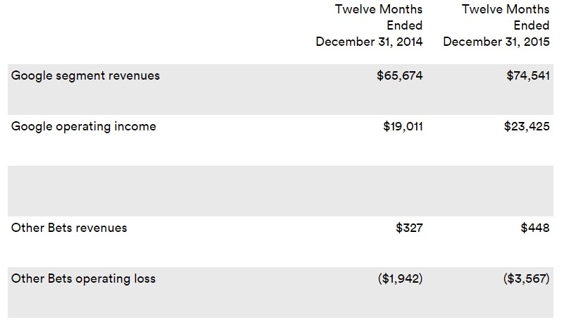 Les autres activités d’Alphabet, rassemblées sous le nom « Other Bets », ont généré un chiffre d’affaires de 448 millions de dollars en 2015 (contre 327 millions l’an passé et seulement 12 millions en 2013) ; pour une perte opérationnelle estimée à 3,567 milliards de dollars en 2015 (contre 1,942 milliards en 2014).