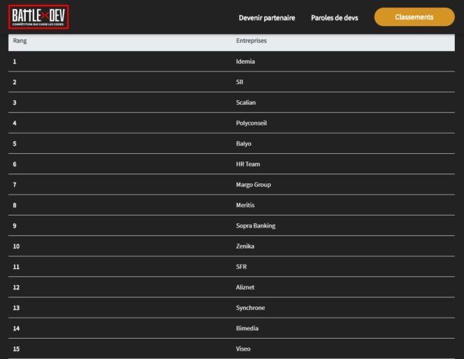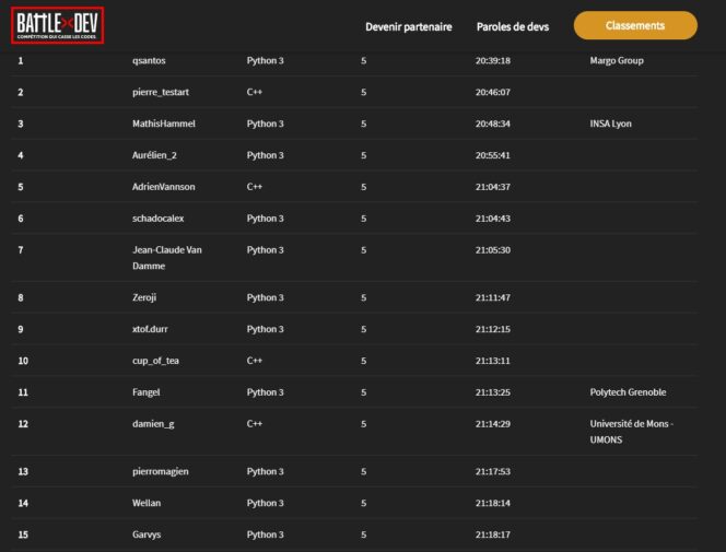 Plus de 5500 développeurs se sont affrontés mardi à l’occasion de la BattleDev. Le concours de code a encore mobilisé les développeurs, les entreprises et les écoles au cours de 6 exercices. Merci à tous pour votre participation !