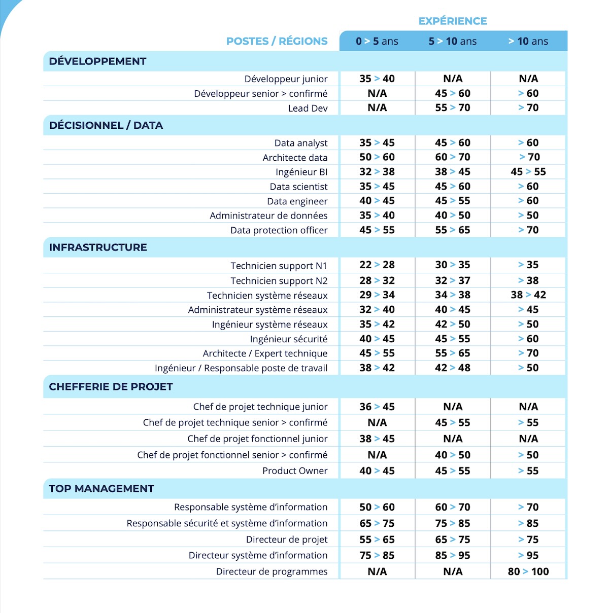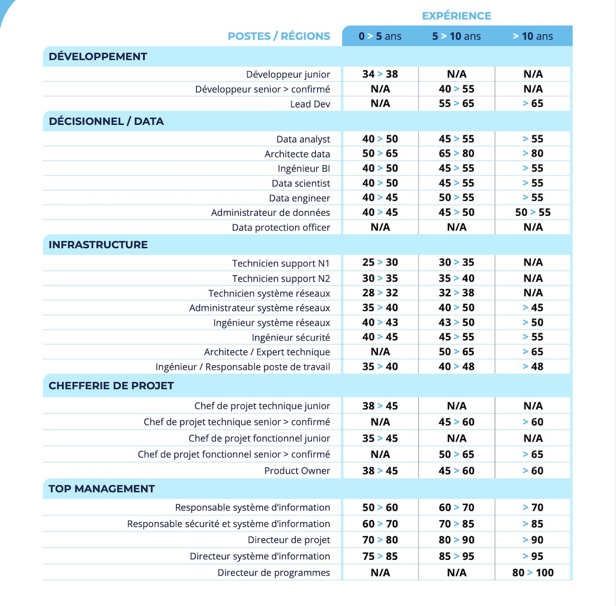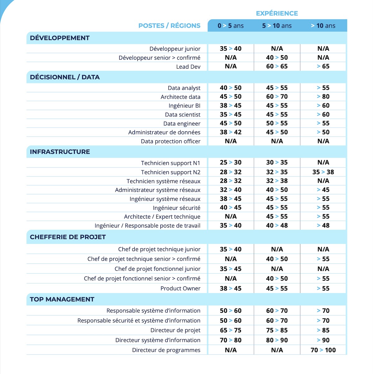 Les métiers de la cybersécurité et de l’infrastructure affichent aussi des niveaux élevés. Un ingénieur cybersécurité commence entre 45 000 et 50 000 € par an et peut atteindre 85 000 € avec une dizaine d’années d’expérience, tandis qu’un RSSI dépassera les 95 000 € annuels. Dans l’infrastructure, les écarts sont importants entre les fonctions opérationnelles et expertes. Les techniciens support N1 se situent entre 26 000 et 32 000 €, alors que les experts techniques pourront dépasser les 95 000 € après dix ans d’expérience. Enfin, les postes de pilotage confirment leur positionnement haut de gamme, avec des directeurs de projet ou de systèmes d’information qui dépasseront les 80 000 €, avec les premiers qui pourront atteindre 130 000 € à haut niveau d’expérience.