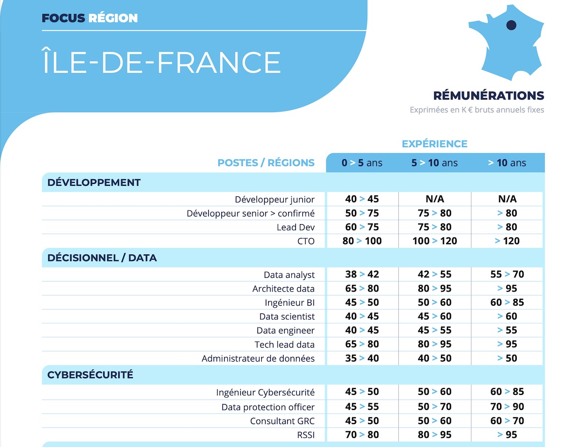 En Île-de-France et à Paris, les salaires restent, sans surprise, parmi les plus élevés du marché, même dans un contexte de ralentissement, explique Fed IT. Les métiers du développement conservent leur attractivité : un développeur junior se situe entre 40 et 45 000 € annuels, tandis qu’un profil confirmé peut atteindre 75 000 à 80 000 €. Les postes plus stratégiques, pour des profils expérimentés, comme Lead Developer ou CTO, dépassent facilement les 80 000 € et peuvent franchir les 120 000 € pour les fonctions de direction. Du côté de la data, les rémunérations progressent également avec l’expérience : un data analyst débute autour de 38 000 à 42 000 €, quand un data engineer senior dépasse les 55 000 €, et qu’un architecte data se situe au-delà de 95 000 € après dix ans.