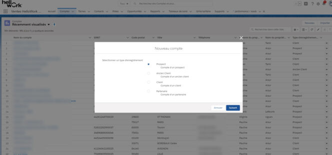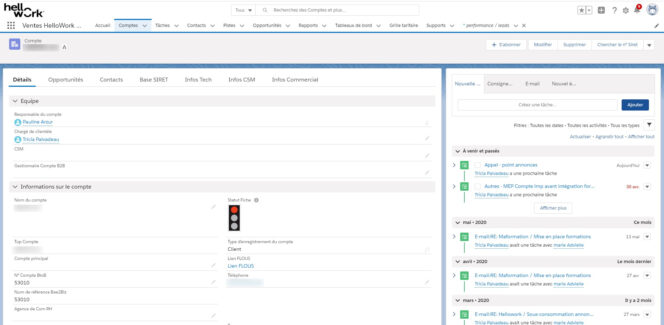 Ces fiches clients peuvent être modifiées ou enrichies par tous les collaborateurs, ce qui permet d’avoir un fichier client continuellement mis à jour. La dimension Cloud de Salesforce permet d’accéder tout le temps et partout à ce fichier qui est mis à jour en direct. Dans le cas d’Hellowork, cela représente plusieurs dizaines de milliers de comptes. Impossible donc de passer par un tableur hébergé en local et mis à jour de façon chaotique sur plusieurs fichiers.