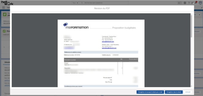 Salesforce permet ensuite d’envoyer des devis aux différents prospects. Le devis est aux couleurs de notre marque, ou de nos différents produits, et comprend toutes les informations importantes : date de validité, acompte, conditions particulières, adresse de facturation… Tous les devis sont ensuite centralisés, et accessibles par les différents membres de l’équipe commerciale. L’outil est très bien fait et donne l’accès à toute la grille tarifaire de l’entreprise (qui peut parfois être complexe, quand le groupe gère plusieurs marques et des dizaines ou centaines de produits).