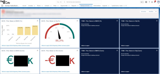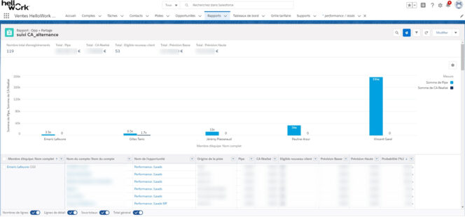Salesforce vous permet de rassembler au même endroit tous vos prospects et toutes vos opportunités commerciales. Chez Hellowork, chaque opportunité est d’abord qualifiée par le commercial et tout le processus allant de l’identification d’un prospect à la signature du devis est suivie via Salesforce. Nous faisons aussi remonter sur notre CRM tous nos leads générés depuis nos actions marketing B2B en ligne. Cette gestion précise des opportunités permet de mettre en place un pipeline commercial complet avec une vue sur les objectifs. Salesforce nous permet de qualifier toutes nos opportunités et donc de faire des prévisions sur l’activité commerciale et sur les performances de chaque commercial ou de chaque service.