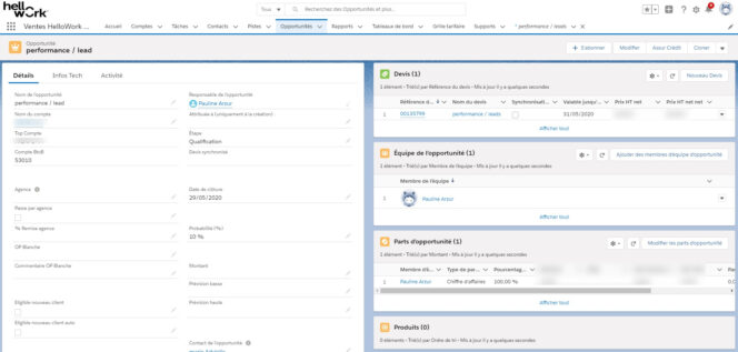 Salesforce est un CRM complet et hébergé sur le cloud qui permet à tous les collaborateurs d’avoir le même niveau d’information sur les actions commerciales. C’est la solution que nous utilisons au quotidien pour le service commercial d’Hellowork (dont fait partie le BDM) composé d’environ 145 personnes – commerciaux terrains et sédentaires, chargés de clientèle, managers commerciaux, équipes marketing B2B – pour nos différentes marques : RegionsJob, MaFormation, BDM, Cadreo… Contrairement aux idées reçues sur les CRM, son utilisation est simple et permet de mettre en place une stratégie commerciale unifiée à l’échelle de la société. Nous avons suivi l’utilisation du service par Pauline Arzur, Team Leader de notre équipe commerciale en charge notamment de la commercialisation du site maformation.fr.