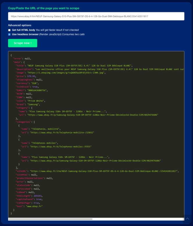 Les résultats de scraping apparaissent instantanément, vous pourrez ainsi tester plusieurs URLs et voir si Scraping Bot est une bonne solution pour vos besoins.