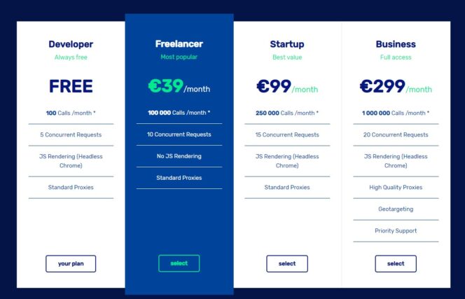 Au niveau des tarifs, Scraping bot se montre tout à fait abordable, avec un pricing selon le volume d’appels réalisés. Un plan gratuit permet de faire 100 requêtes gratuitement, chaque mois, avec des proxies standards. Pour 39€ par mois, vous bénéficiez de 100 000 requêtes mensuelles, et de 250 000 requêtes pour 99€. Le plan Business permet 1 000 000 de requêtes par mois et coûte 299€, il comprend en outre des proxies haute qualité et le geotargeting.