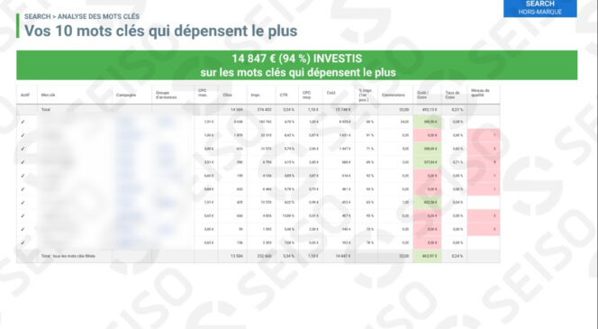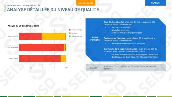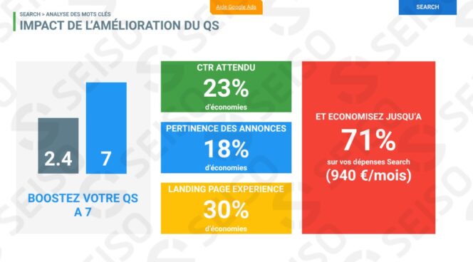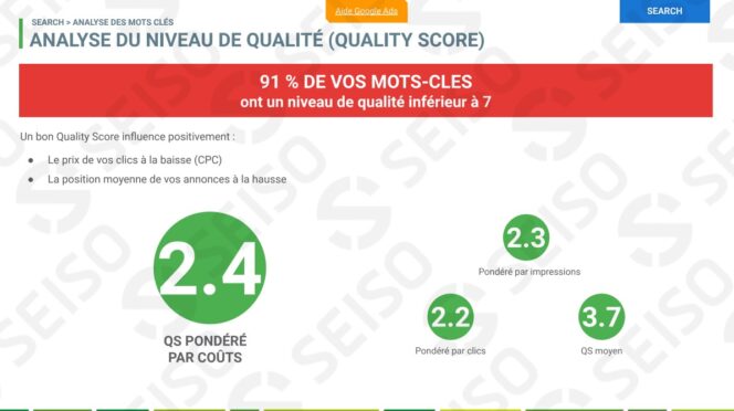 SEISO fait aussi une analyse des mots clés utilisés pour les campagnes. Dans notre cas, le quality score est souvent trop faible, et le travailler permettrait de faire baisser notre CPC, tout en faisant remonter la position de nos annonces.