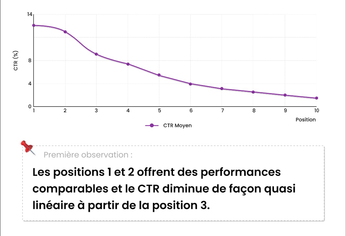 Deux études menées par ThotSEO sur Google France en avril 2025, portant au total sur plus de 130 000 URLs et près de 12 millions de requêtes, révèlent de nouvelles dynamiques de visibilité sur le moteur de recherche. L’un des enseignements clés : la première position sur Google ne garantit plus un avantage décisif sur la deuxième. Le taux de clics (CTR) moyen en position 1 s’élève à 11,84 %, contre 11,10 % en position 2, un écart devenu quasi négligeable (voir image de une).