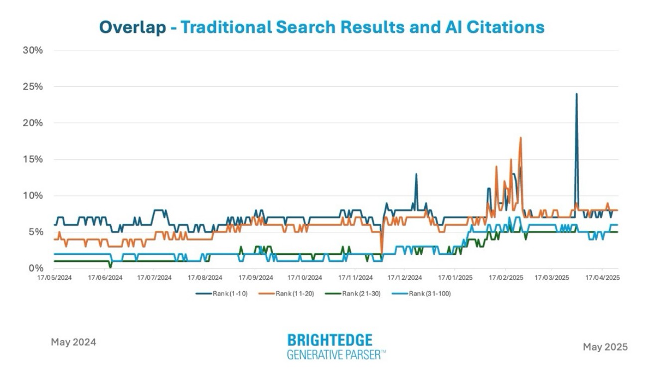 L’étude révèle que les sources utilisées par AI Overviews ont également évolué de manière particulièrement marquée entre le 14 mai 2024 et le 14 mai 2025. AIO ne se limite plus aux pages les mieux classées pour sélectionner les contenus qu’il cite dans ses réponses. Depuis une mise à jour importante en mars 2025, l’algorithme tire désormais des informations de pages bien plus éloignées dans les résultats organiques, notamment celles classées entre les positions 21 et 100.