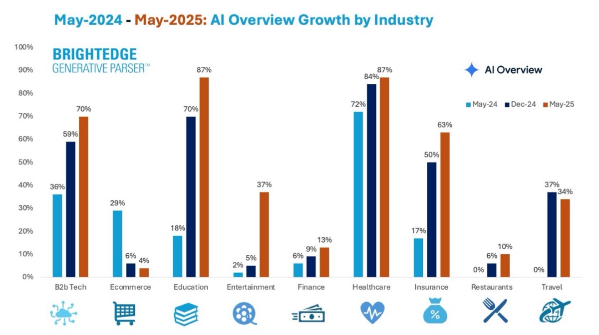 À ses débuts, AI Overviews était testé avec précaution par Google, qui évitait d’intervenir de manière trop importante sur certains types de contenus. Cette période semble révolue : Google déploie massivement les AI Overviews dans des secteurs à fort besoin d’autorité et de contenu structuré (voir image de une), comme la tech B2B (70 % des requêtes sont concernées, contre 36 % il y a un an), les assurances (63 %), mais également sur des sujets sensibles comme la santé (87 %) et l’éducation (87 % également). Les contenus publiés sur ces thématiques sont considérés comme factuels, souvent « evergreen ». Ils sont donc parfaitement adaptés aux résumés IA.