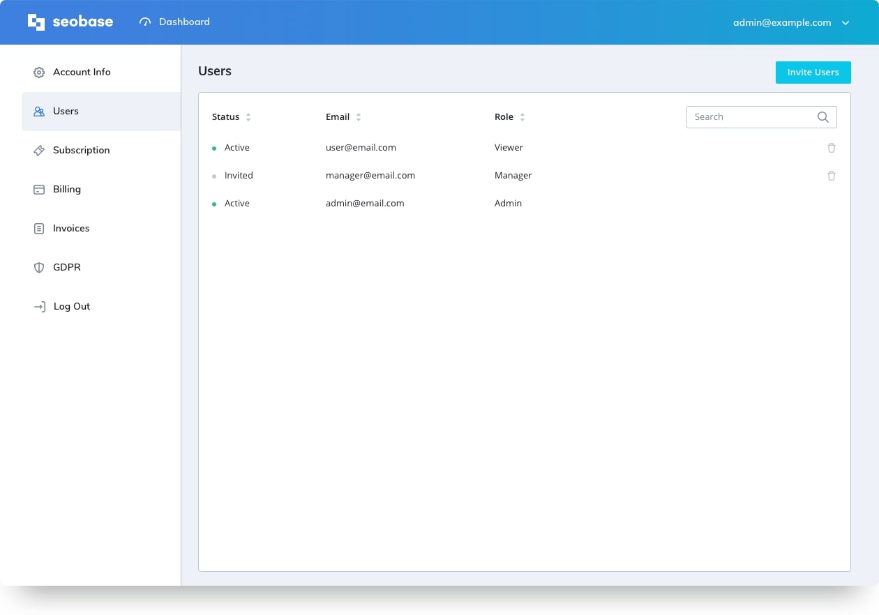 Besoin de travailler en équipe ? La plateforme permet d’inviter et de gérer jusqu’à 30 utilisateurs (plan Professional). Ce qui est intéressant, c’est que vous pouvez attribuer des rôles différents pour les utilisateurs invités : Admin, Manager, Viewer…