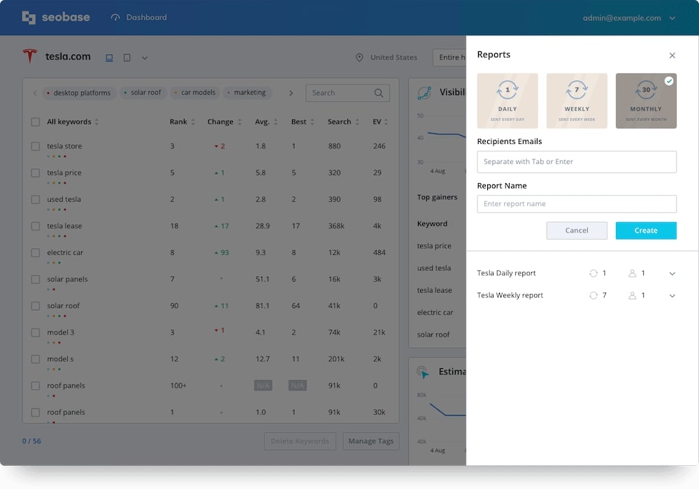 Vous avez la possibilité de générer très facilement des rapports quotidiens, hebdomadaires ou mensuels. Vous pouvez donner accès à ces rapports à vos clients ou collaborateurs. Ils auront alors une vue sur les données les plus importantes dont les performances des mots clés suivis, les visites estimées, le flux de position des mots clés…