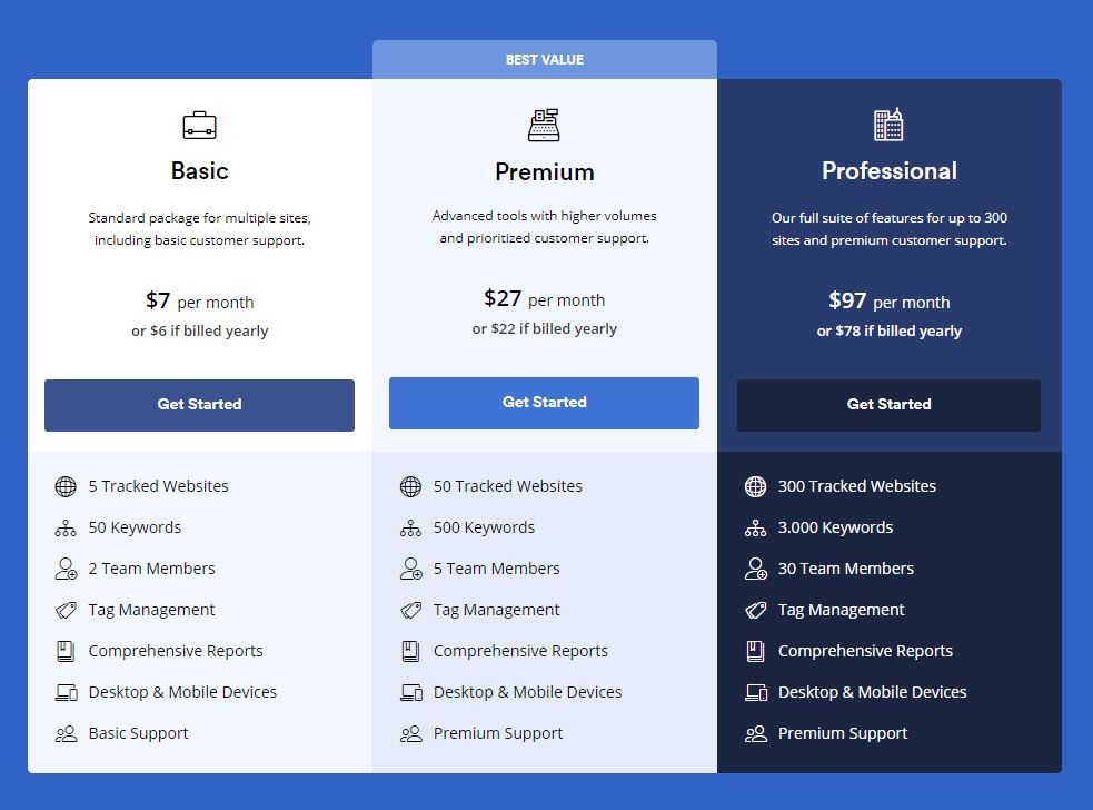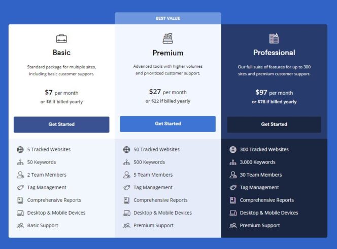 - L’offre Premium à 27 $ par mois : 50 sites, 500 mots clés, 5 utilisateurs