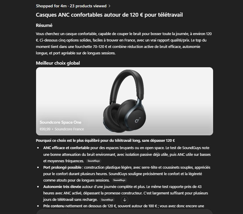 À l’usage, Shopping Research est une fonctionnalité très prometteuse. Nous avons constaté que les produits suggérés sont cohérents avec les critères de nos demandes, y compris sur certains domaines complexes comme la mode. OpenAI précise qu’elle est « particulièrement performante dans les catégories riches en détails comme l’électronique, la beauté, la maison et le jardin, la cuisine et l’électroménager, ainsi que le sport et les activités de plein air ».