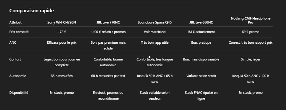 Après un temps de recherche, ChatGPT vous fournit une liste de produits correspondant à vos attentes. Un tableau comparatif vient résumer les caractéristiques des différentes propositions.