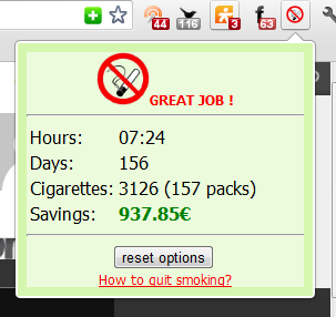 Quitomzilla est l’exact équivalent de Smoking Calculator, mais pour les utilisateurs de Mozilla. Lui aussi comptabilisera les jours, les heures et l’argent économisé grâce à l’arrêt du tabac. Vous savez ce qu’il vous reste à faire !