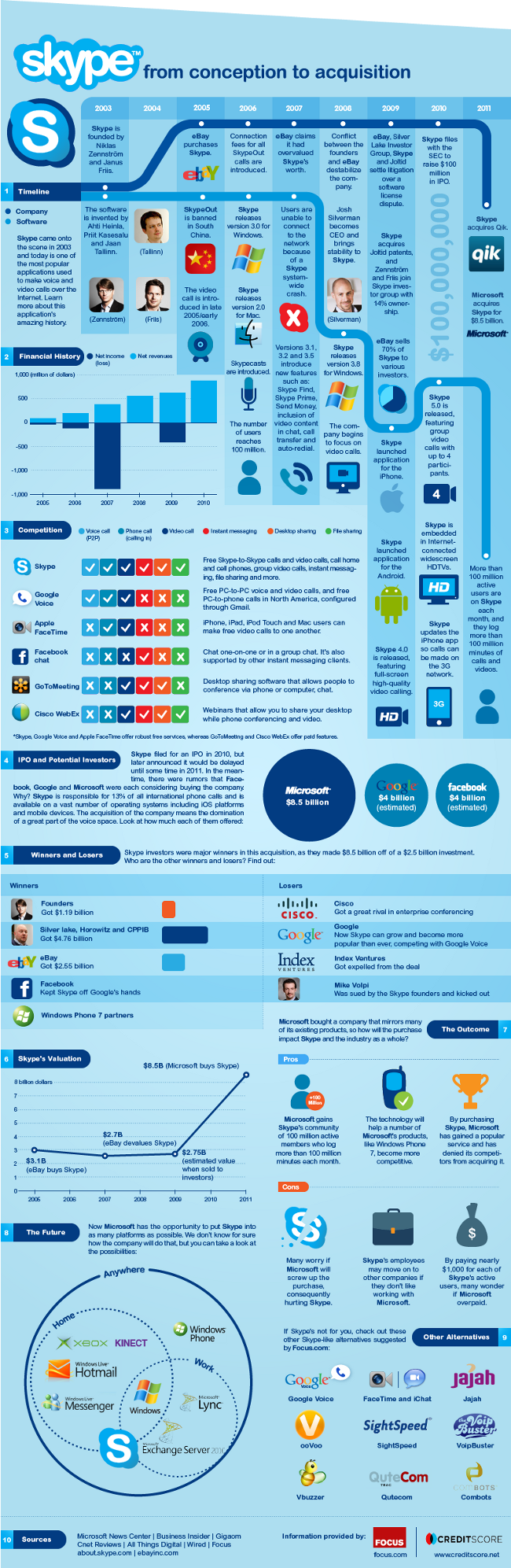 La nouvelle a fait grand bruit la semaine dernière : le service de téléphonie par Internet Skype a été racheté par Microsoft, qui a fait un chèque de 8,5 milliards de dollars pour l’acquérir – son achat le plus onéreux depuis la création du géant de l’informatique ! Si les plans de Microsoft pour Skype restent encore incertains, il est bon de jeter un oeil sur le passé de la compagnie, de sa création jusqu’à ce récent rachat. Cette infographie très complète fait donc le point sur Skype, son histoire, ses atouts et ses concurrents. Depuis sa création en 2003, Skype avait déjà été racheté par Ebay (en 2005), puis 70% des parts avaient été revendues 4 ans plus tard, Ebay estimant l’avoir payé bien trop cher. A l’époque cependant, le prix était largement inférieur à ce qu’a dû débourser Microsoft ! Aujourd’hui, le service compte plus de 100 millions d’utilisateurs dans le monde. Concurrencé par Google Voice, FaceTime et consorts, Skype reste la solution offrant le plus de possibilités, comme le montre l’infographie. Elle est très dense, mais presque exhaustive concernant Skype et son univers.