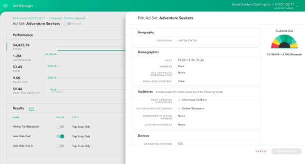 L’ads manager va permettre à tous les annonceurs d’acheter de la visibilité sur Snapchat eux-même. La plateforme lance aussi un Business Manager pour gérer les différents rôles, exactement sur le même modèle que Facebook.