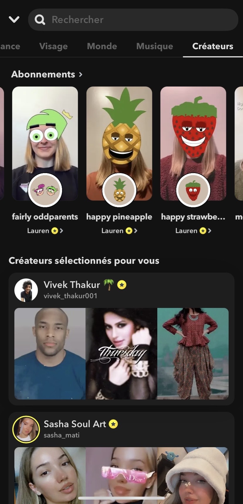 Il est possible de s’abonner aux créateurs de Lens, qui ont été sélectionnées pour vous en fonction de vos précédents effets envoyés. Rendez-vous dans l’onglet Explorer, puis dans la section Créateurs tout en haut à droite, cliquez sur un créateur et appuyez sur S’abonner. Vous retrouvez ensuite facilement tous vos abonnements dans cette même section, à tout moment. Si vous souhaitez vous désabonner d’un créateur de Lens, effectuez un appui long sur l’un de ces effets.