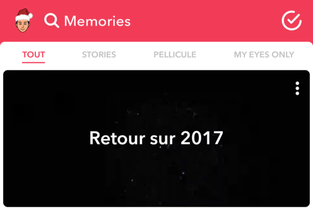Snapchat a rassemblé vos snaps de l’année au sein d’une story dédiée. Pour y accéder, vous devez aller dans Memories (swipe vers le haut depuis l’écran principal (appareil photo) ou clic sur l’icône sous le déclencheur). Vous n’avez plus qu’à cliquer sur « Retour sur 2017 » pour visionner votre rétrospective de l’année.