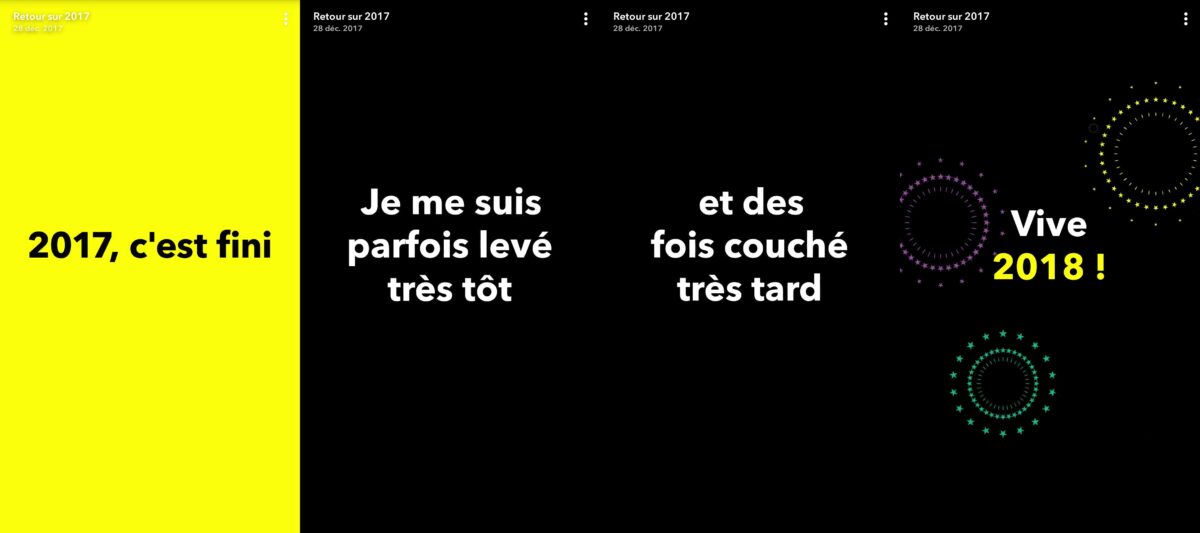 Snapchat a rassemblé vos snaps de l’année au sein d’une story dédiée. Pour y accéder, vous devez aller dans Memories (swipe vers le haut depuis l’écran principal (appareil photo) ou clic sur l’icône sous le déclencheur). Vous n’avez plus qu’à cliquer sur « Retour sur 2017 » pour visionner votre rétrospective de l’année.