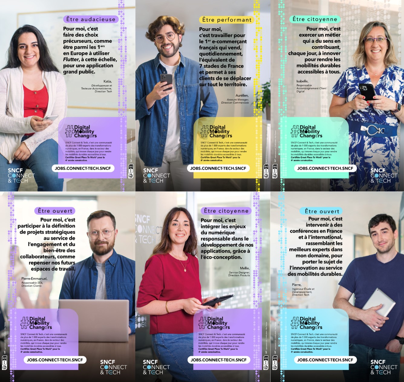 Ce dispositif de communication a pour ambition de soutenir nos objectifs de recrutement pour 2023 et 2024. Il donne vie aux 5 piliers de notre marque employeur et met en avant nos valeurs et expertises portées par 9 de nos 1 000 #DigitalMobilityChangers, explique Charlotte de La Ronde, directrice de la communication, RSE et affaires publiques de SNCF Connect & Tech.