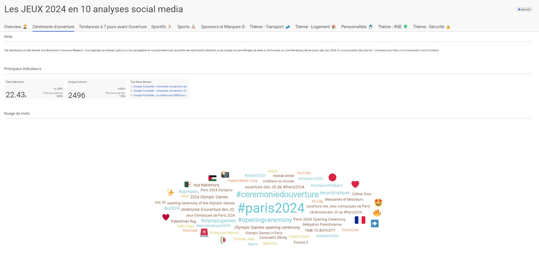 Conçu par les analystes de l’équipe insights de Brandwatch, ce dashboard dresse un panorama complet des conversations autour de cet événement incontournable : transport, logement, sportifs, sécurité… Des insights uniques qui permettent de mieux comprendre l’événement, mais aussi l’exposition des marques associées et des sponsors.