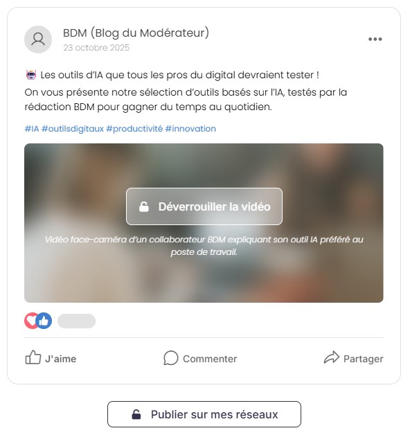 En cliquant sur chaque proposition, il est possible d’accéder à la publication déjà rédigée avec une suggestion d’illustration ou de vidéo. En souscrivant à un abonnement, chaque post peut être enrichi automatiquement avec des visuels issus de vos tournages : photos, GIF ou vidéos courtes, accessibles depuis la bibliothèque intégrée.