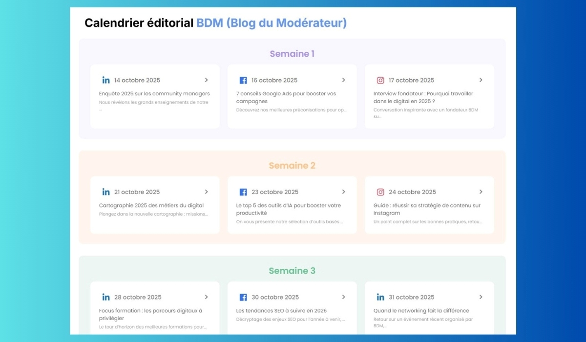 Quelques secondes plus tard, vous accédez à votre calendrier dans votre boîte mail. Ci-dessous, vous pouvez consulter le calendrier conçu pour BDM. On y retrouve le partage de contenus existants (7 conseils Google Ads, notre enquête sur les community managers…), mais également des propositions inédites basées sur notre ligne éditoriale, adaptées aux plateformes que nous avons choisies : un guide pour réussir sa stratégie sur Instagram, un post sur le networking pour LinkedIn, les erreurs à éviter en community management pour Facebook…