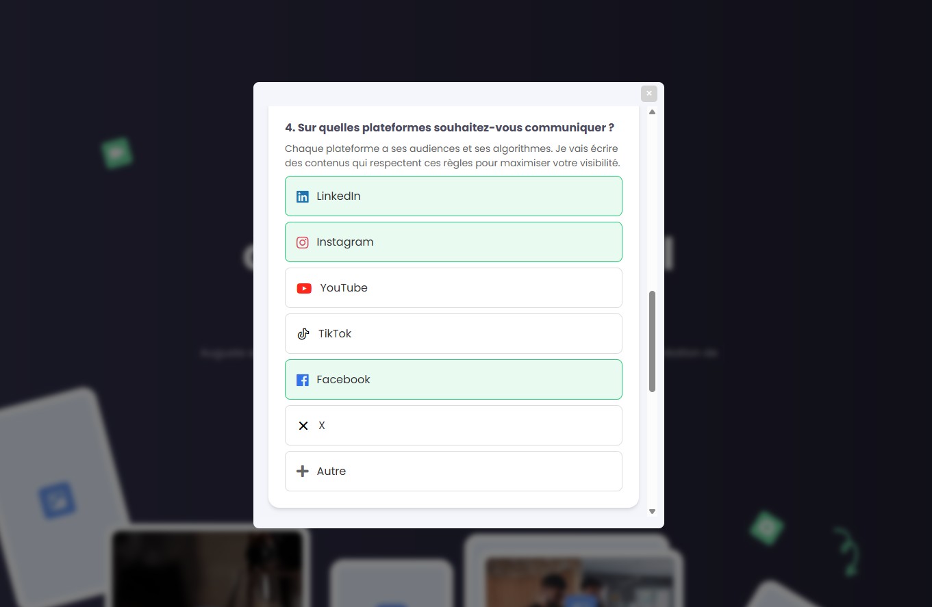 Après avoir renseigné quelques informations sur la taille de votre entreprise et votre rôle dans celle-ci, vous êtes invité à indiquer les réseaux sociaux sur lesquels vous souhaitez communiquer. La dernière étape consiste à fournir votre contact afin de recevoir le calendrier personnalisé.