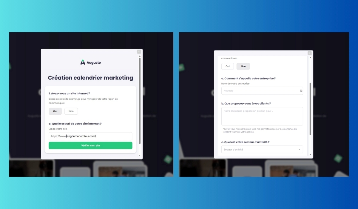 Pour créer le calendrier, nous commençons par intégrer l’URL de notre site, que la plateforme sera en mesure de parcourir pour comprendre nos thématiques et notre ligne éditoriale. Si vous n’avez pas de site Internet, il vous suffira de répondre à quelques questions pour qu’Auguste.io comprenne la nature de votre activité.