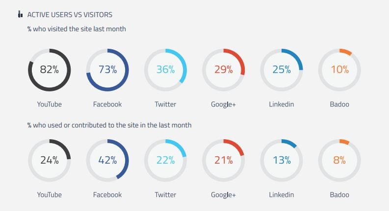 70% des personnes qui se sont connectées à Facebook durant le mois ont aimé une publication. En parallèle, seuls 33% des utilisateurs actifs sur Google+ ont ajouté un +1 à un contenu. Les usagers de Twitter apprécient la lecture des informations, les Trending Topics et « regarder ce qu’il se passe sans publier de contenu ». D’un point de vue général, on remarque assez vite le côté « Contributeur », beaucoup plus marqué sur Facebook que sur les autres réseaux sociaux. Les membres aiment stalker leurs amis, mais ils partagent aussi beaucoup de contenu sur le réseau.