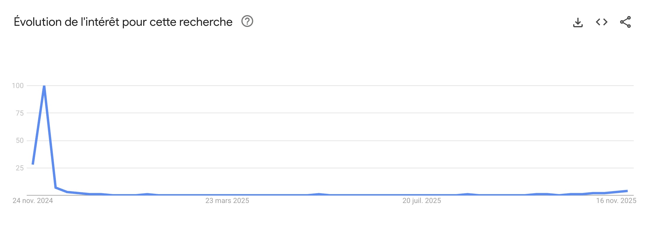 C’est, en tout cas, ce que prédisent plusieurs médias qui, chaque année, se muent en bookmakers pour anticiper la sortie de cette rétrospective annuelle qui synthétise les écoutes pour les transformer en un récit instagrammable, prêt à être fièrement exhibé en ligne. Ces articles ne vous apprendront pas grand-chose, si ce n’est que Spotify Wrapped tombe traditionnellement un mercredi, ce qui a permis à l’auteur de cet article de tenter un pari particulièrement osé en ouverture. Mais ils réussiront leur mission : capter les requêtes autour d’un sujet pour lequel l’intérêt culmine fin novembre, comme l’attestent les données de Google Trends.