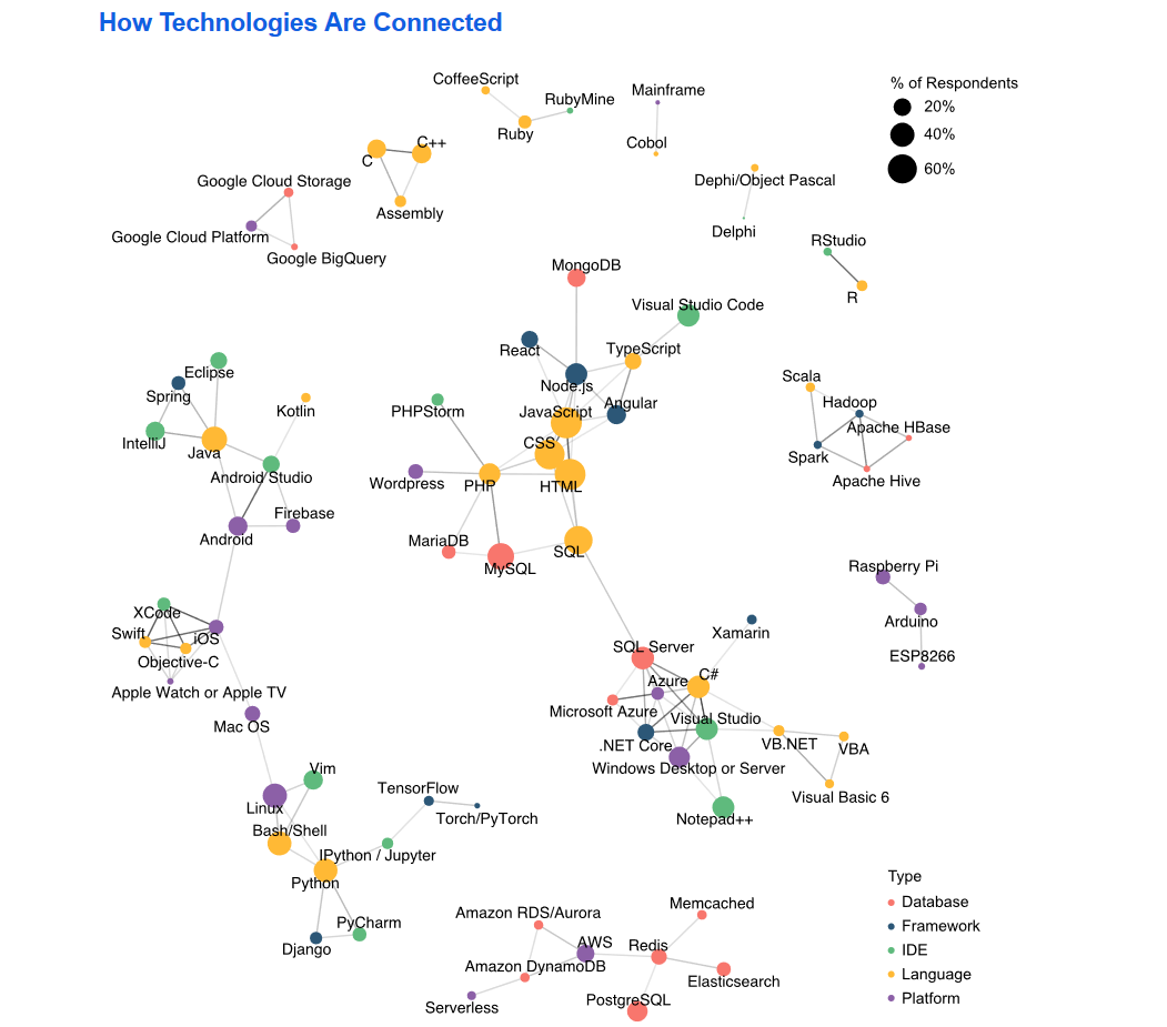 Du côté des frameworks, Node.js et AngularJS continuent d’être les technologies les plus couramment utilisées dans cette catégorie, avec React et .Net Core. Concernant les bases de données, MySQL et SQL restent leader dans leur catégorie.