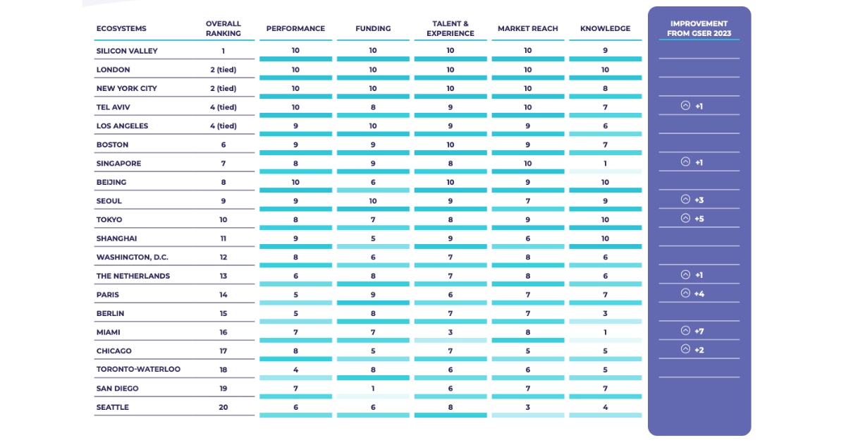 - Paris améliore également sa position avec 4 places gagnées pour se classer 14e écosystème mondial.