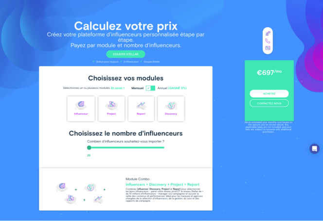 En ce qui concerne les prix, la tarification se fait selon les besoins. La solution est en effet organisée en modules, que vous pouvez activer ou non selon vos problématiques et votre budget. Le prix est ensuite fonction du nombre d’influenceurs suivis.
