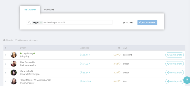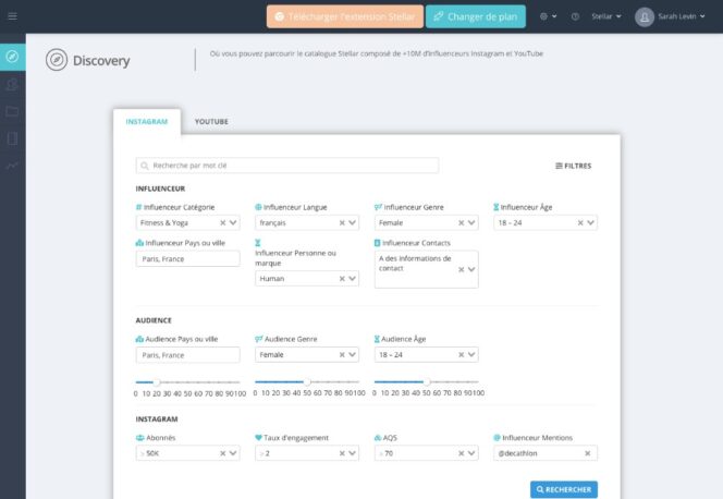 Une série de filtres permet de faire une recherche vraiment précise. Vous pouvez ainsi rechercher les influenceurs en fonction de la taille de leur communauté ou de leur engagement sur les réseaux sociaux, en fonction de leurs catégories thématiques ou encore de leurs données démographiques : langue, genre, âge, etc. Les filtres portent aussi et surtout sur les audiences suivant l’influenceur : on peut donc rechercher un influenceur en fonction de la ville, du genre, de l’âge ou encore de l’authenticité des abonnés auxquels il s’adresse.