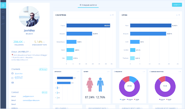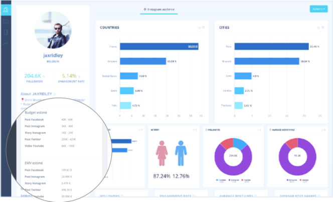 L’outil collecte également automatiquement des analytiques complets sur l’influenceur de manière globale et par réseau social : nombre d’abonnés, taux d’engagement, fréquence des posts, vues des vidéos, etc. L’audience est elle aussi passée au crible avec un ensemble de métriques validées par Hypeauditor qui permettent à une marque de juger si oui ou non, l’influenceur s’adresse à ses clients potentiels : pays de l’audience, villes, langue, genre, âge, intérêts, qualité de l’audience avec détection de fraude (faux J’aime ou abonnés). Il est impossible pour un compte « bidon » d’avoir des indicateurs positifs.